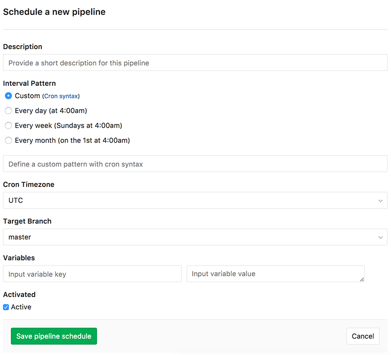 The pipelines won't be executed precisely, because schedules are handled by Sidekiq, which runs according to its interval. For example, if you set a schedule to create a pipeline every minute (* * * * *) and the Sidekiq worker runs on 00:00 and 12:00 every day (0 */12 * * *), only 2 pipelines will be created per day. To change the Sidekiq worker's frequency, you have to edit the pipeline_schedule_worker_cron value in your gitlab.rb and restart GitLab. For GitLab.com, you can check the dedicated settings page. If you don't have admin access to the server, ask your administrator.
